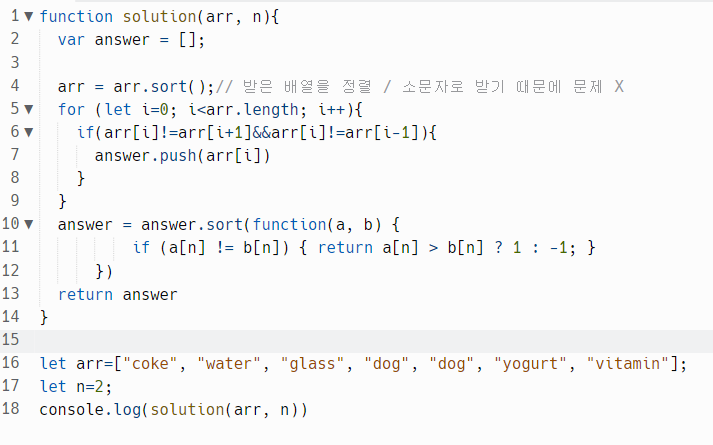 배열 arr와 정수 n이 주어집니다. 배열 arr의 각 원소는 문자열로 이루어져 있습니다. 이때, 배열 arr에서 중복되는 단어는 전부 제거하려고 합니다. 단, 제거된 후 남은 단어들을 반환할 때는 각 문자열의 인덱스 n번째 글자를 기준으로 오름차순 정렬하려 합니다.