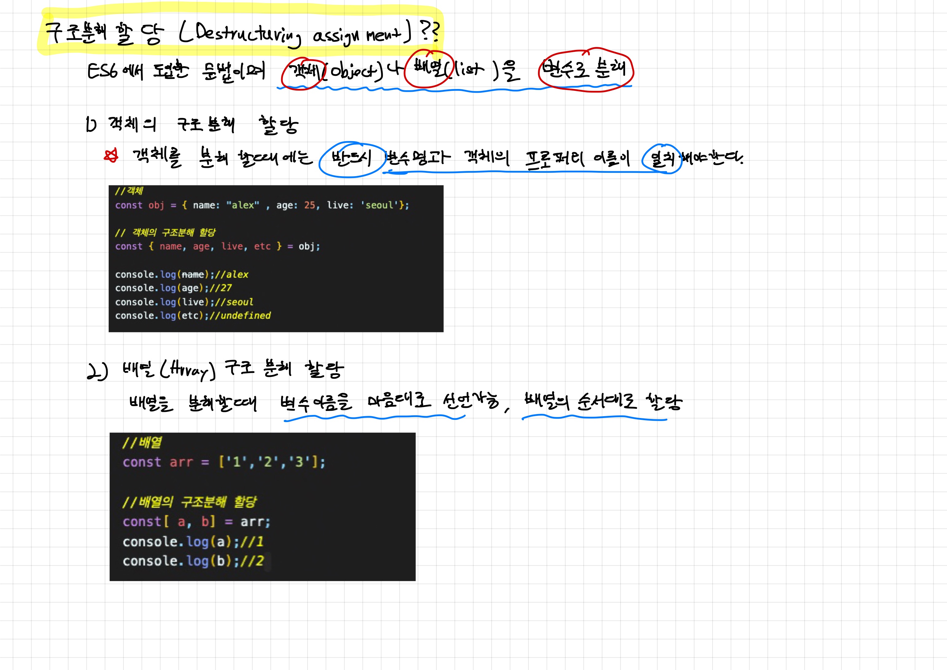 - 구조분해할당(객체나 배열을 변수로 분해)