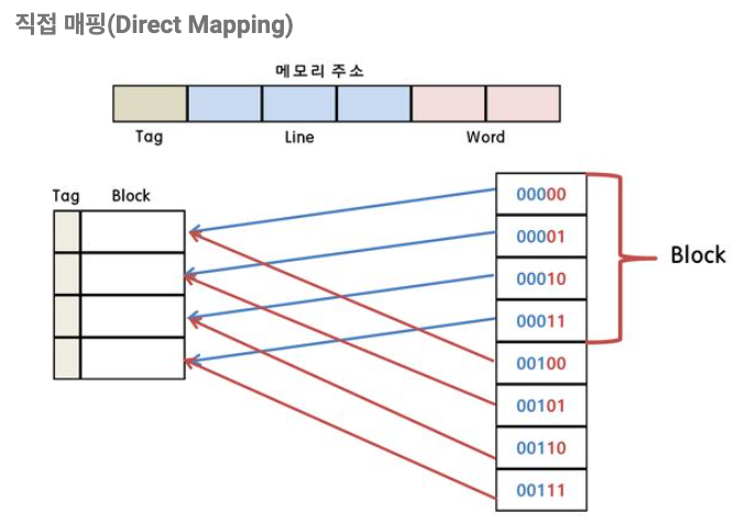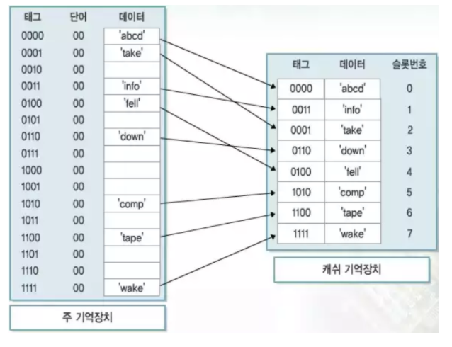 예를 들면 메모리에 첫 번째 요소 00000과 다섯 번째 주소 00100은 캐시 내에 같은 위치에 자리 잡고 있어서 구별이 필요한데, 앞의 세 자리 000과 001로 구별을 할 수 있다.