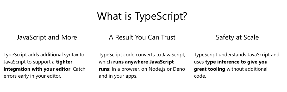 TypeScript extends JavaScript by adding types to the language. TypeScript speeds up your development experience by catching errors and providing fixes before you even run your code.