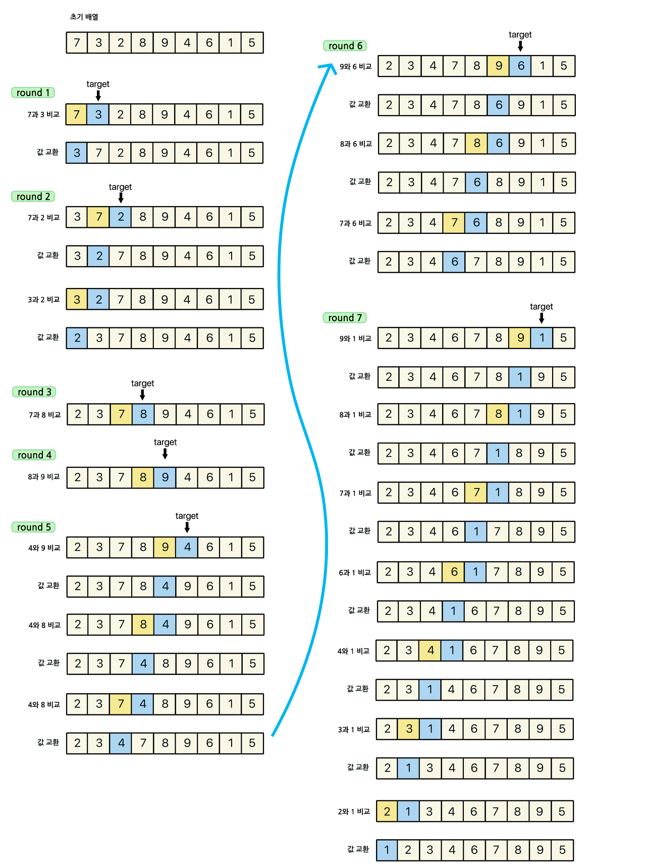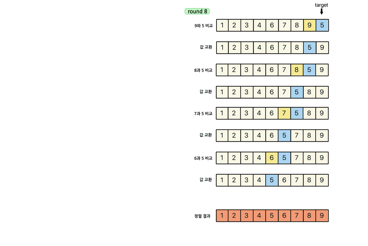 타겟이 되는 숫자가 이전위치에 있던 원소보다 작다면 위치를 서로 교환한다.