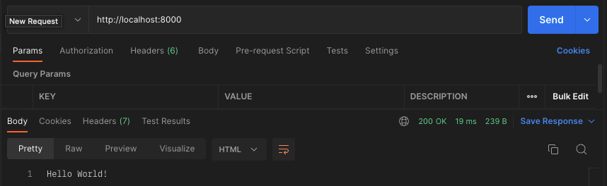 포스트맨으로 요청을 보내게 되면 "Hello World"라는 값을 받게된다.