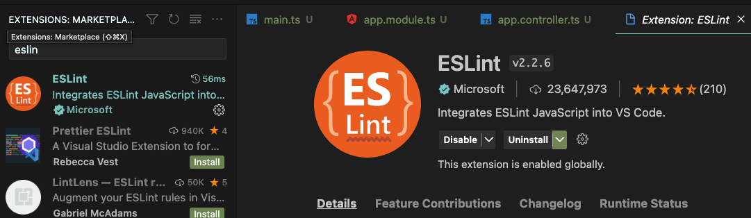 vscode에서 사용하기위해서 는 아래 플러그인(ESlint)을 설치한다.