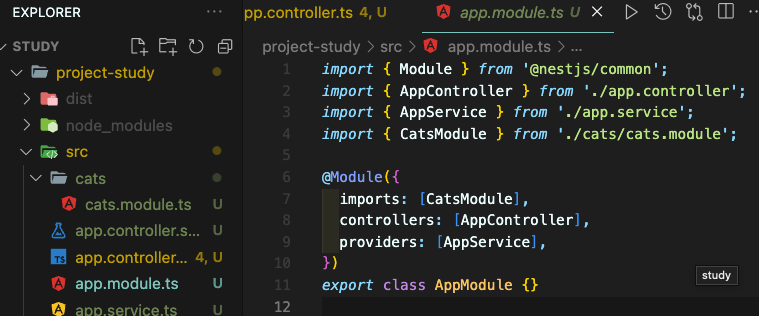 위 명령어를 사용하면 cats 폴더에 컨트롤러가 생기고 모듈에도 자동으로 반영이 된다.