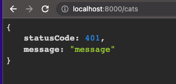 위 HttpExceptionFilter 를 cats.controller GET요청에 적용한 모습