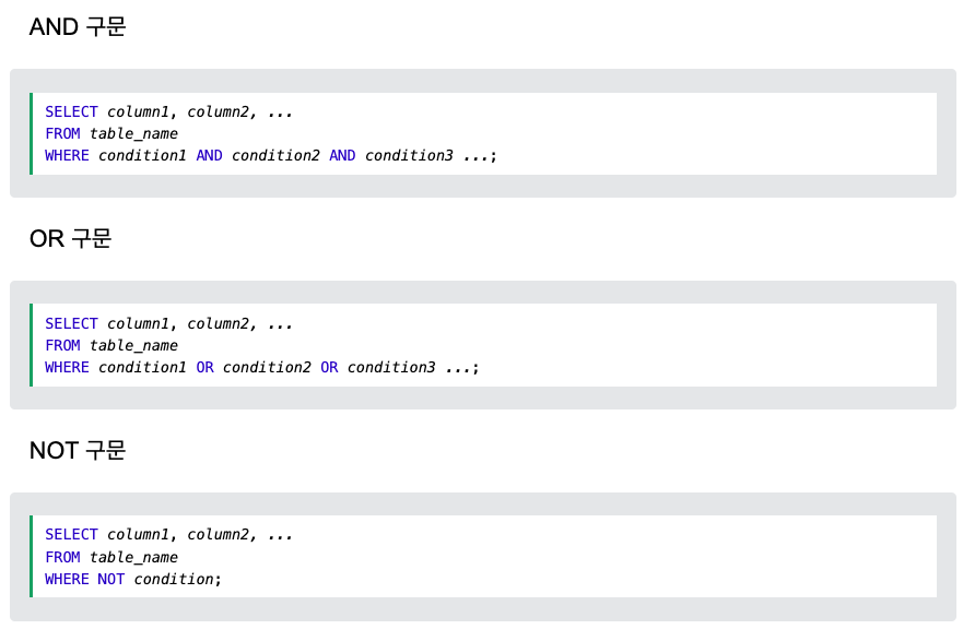 절 은 , 및 연산자 WHERE와 결합할 수 있습니다 . AND, OR , NOT