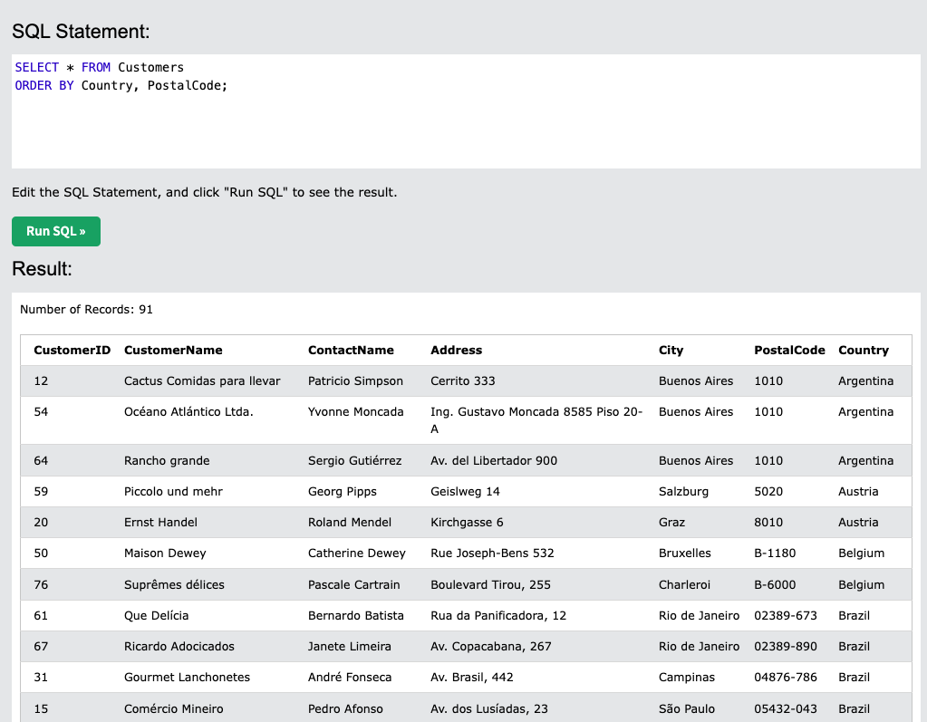 country를 우선적으로 오름차순 정렬후 정렬된 country안에서 PostalCode를 기준으로 오름차순으로 정렬된다.
