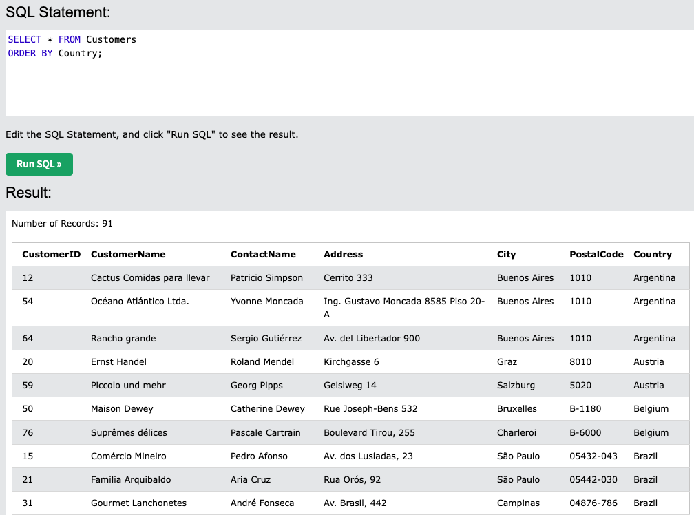 country를 우선적으로 오름차순 정렬후 정렬된 country안에서 PostalCode를 기준으로 오름차순으로 정렬된다.