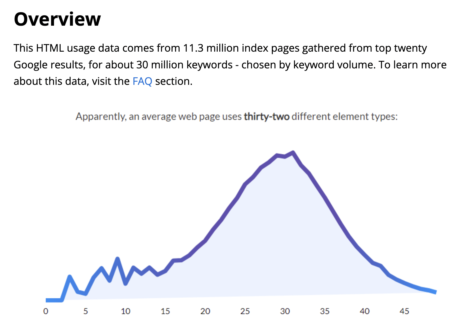 Overview This HTML usage data comes from 11.3 million index pages gathered from top twenty Google results, for about 30 million keywords - chosen by keyword volume. To learn more about this data, visit the FAQ section. Total 11,264,652 pages Doctype The