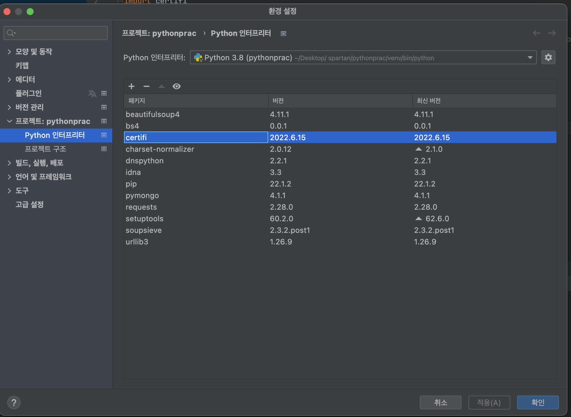 파이참 패키지에서 certifi를 설치한다