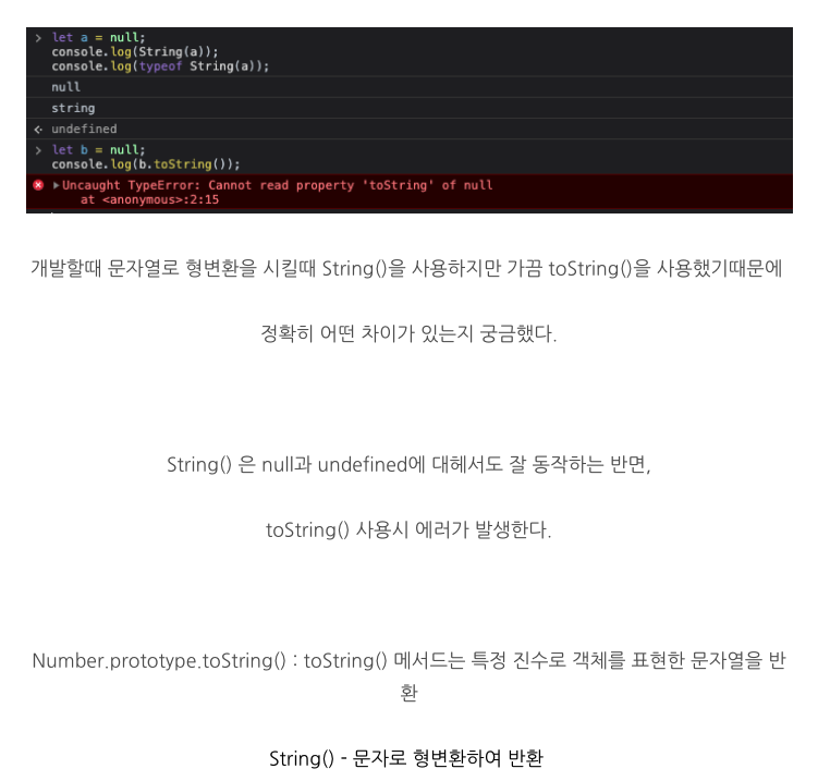개발할때 문자열로 형변환을 시킬때 String()을 사용하지만 가끔 toString()을 사용했기때문에 정확히 어떤 차이가 있는지 궁금했다. String() 은 null과 undefined에 대헤서도 잘 동작하는 반면, toString()