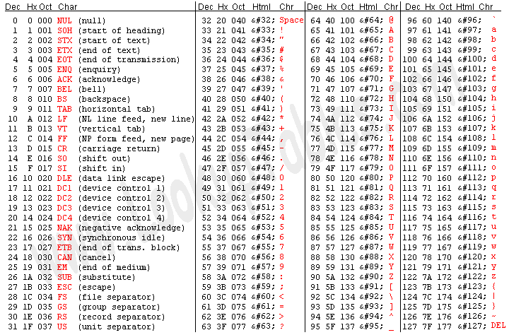 아래표는 아스키코드를 표로 정리 한 것이다.